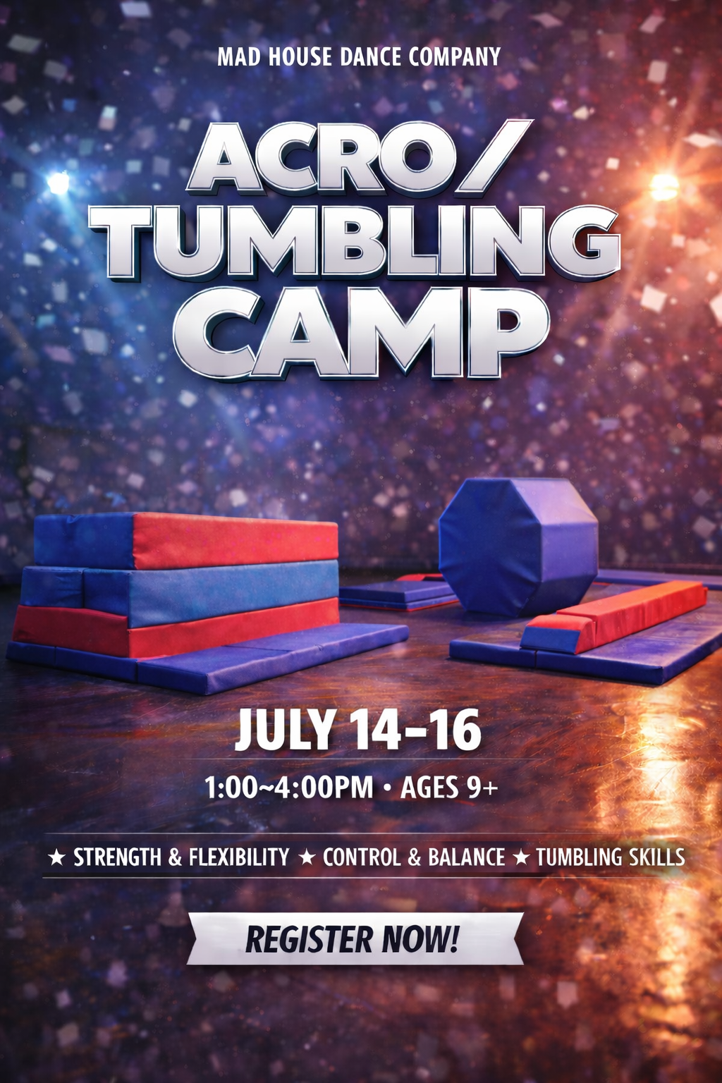 Acro/Tumbling Camp is designed to help dancers improve strength, flexibility, and technique while safely progressing their acro skills. This focused training environment allows dancers to work on drills, technique, and skill development with proper support.