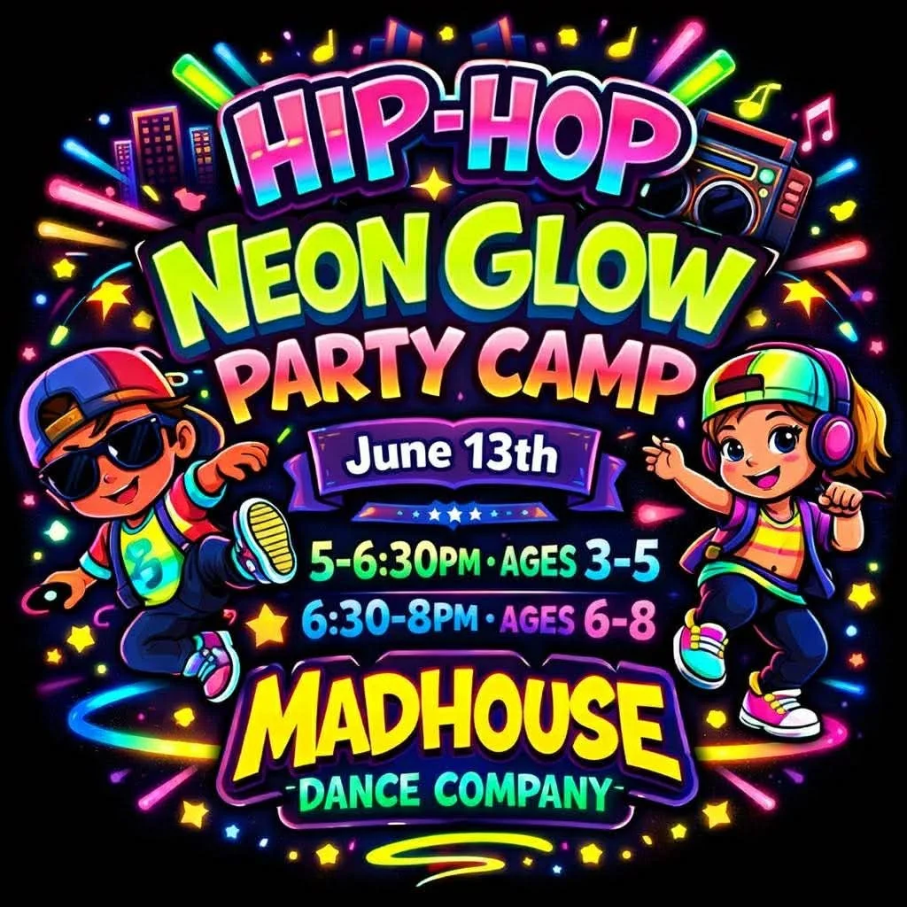 This high-energy camp combines hip hop dance, music, and a neon glow party atmosphere for an unforgettable experience. Dancers will move, groove, and shine in a fun, upbeat environment designed to build confidence and performance skills.